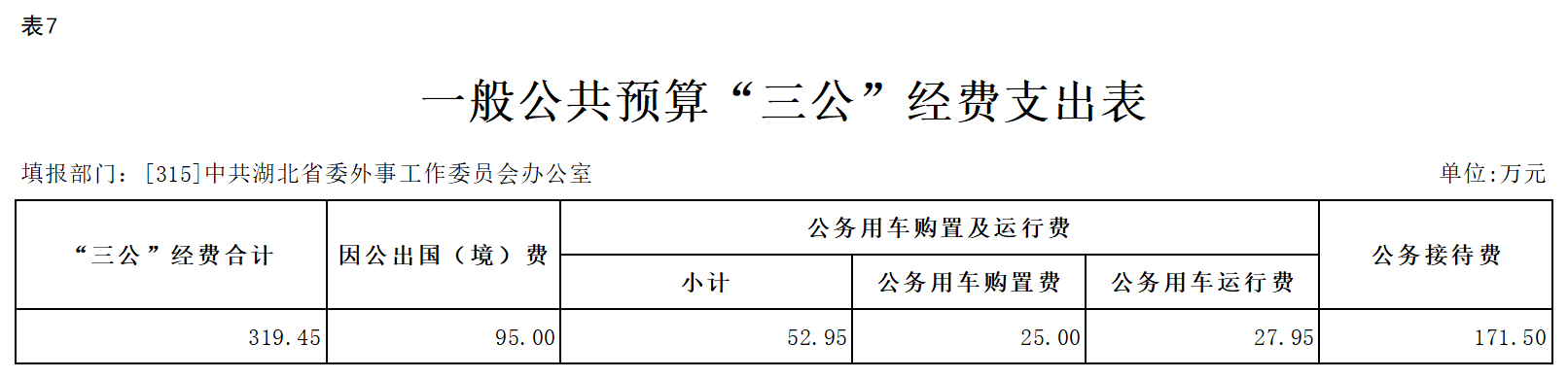 2.“三公”经费:指使用一般公共预算财政拨款安排的因公出国(境)费、公务用车购置及运行维护费和公务接待费。其中,因公出国(境)费用反映单位公务出国(境)的国际旅费、国外城市间交通费、住宿费、伙食费、培训费、公杂费等支出;公务用车购置及运行维护费反映单位公务用车车辆购置支出(含车辆购置税、牌照费)、燃料费、维修费、过桥过路费、保险费、安全奖励费用等支出;公务接待费反映单位按规定开支的各类公务接待(含外宾接待)费用。